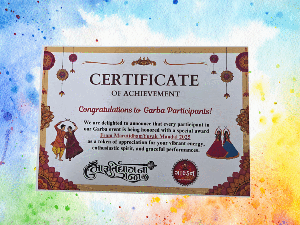 Body: The certificate states that every participant in the Garba event is being honored with a special award from Marutidham Yuvak Mandal 2025 as a token of appreciation for their vibrant energy, enthusiastic spirit, and graceful performances.