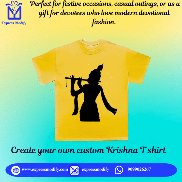 Bring a touch of spirituality and style to your wardrobe with this bright yellow cotton T-shirt featuring a bold black silhouette of Lord Krishna playing the flute. Made from soft, breathable 100% cotton, this tee combines comfort with a meaningful artistic design. Perfect for festive occasions, casual outings, or as a gift for devotees who love modern devotional fashion.