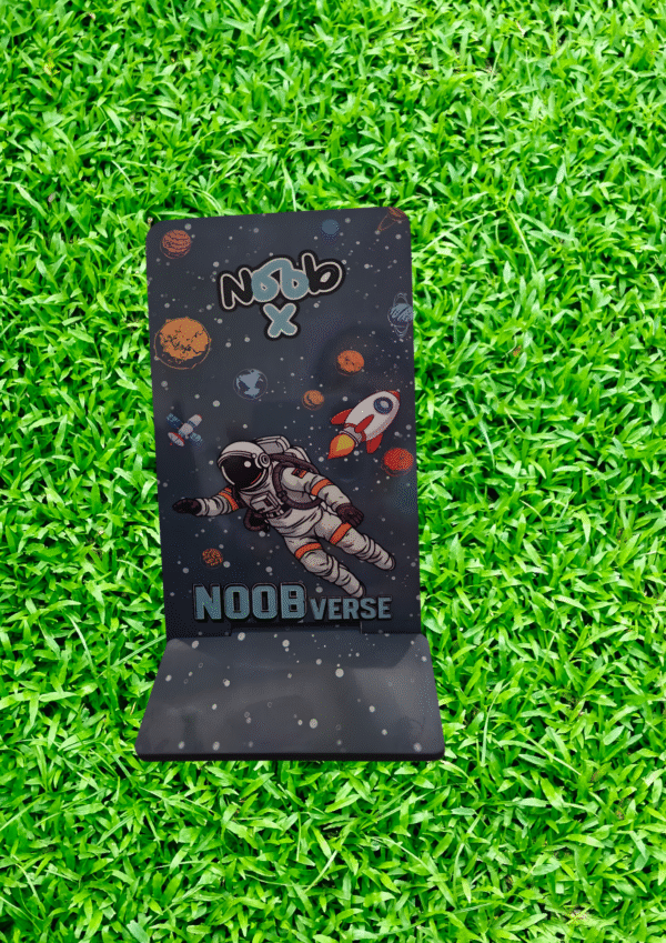 Designed with a vibrant space theme, this stand features a cool astronaut and rocket illustration that brings a cosmic touch to your desk. Made from durable MDF material, it securely holds your smartphone at the perfect viewing angle for calls, videos, or charging.